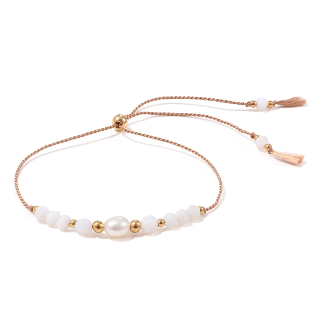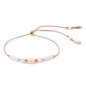 Bransoletka z kamieniem księżycowym na beżowej nici jedwabnej. W centralnym miejscu znajduje się biała perła, a obok niej po obu stronach koraliki z kamienia księżycowego. Całości dopełniają złote kuleczki ze stali szlachetnej, co tworzy niezwykle harmonijną kompozycję. Długość bransoletki można regulować za pomocą wygodnego stopera, co pozwala dopasować ją do każdego nadgarstka.