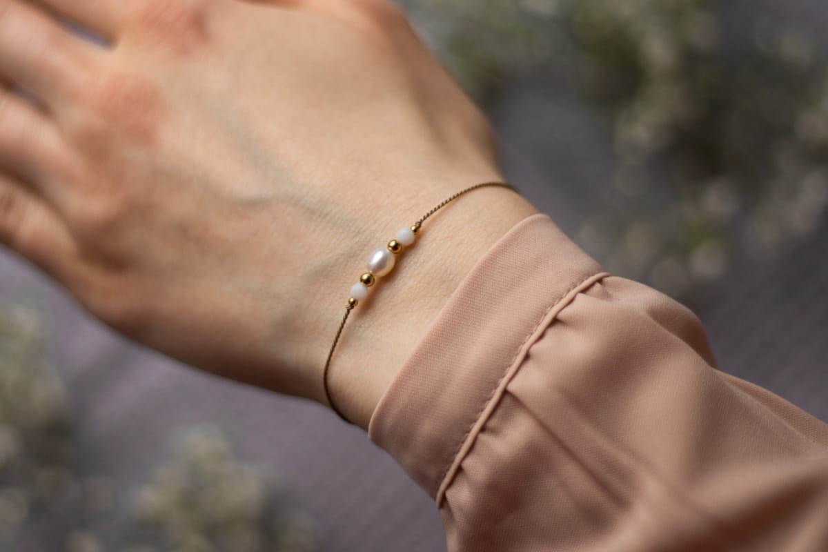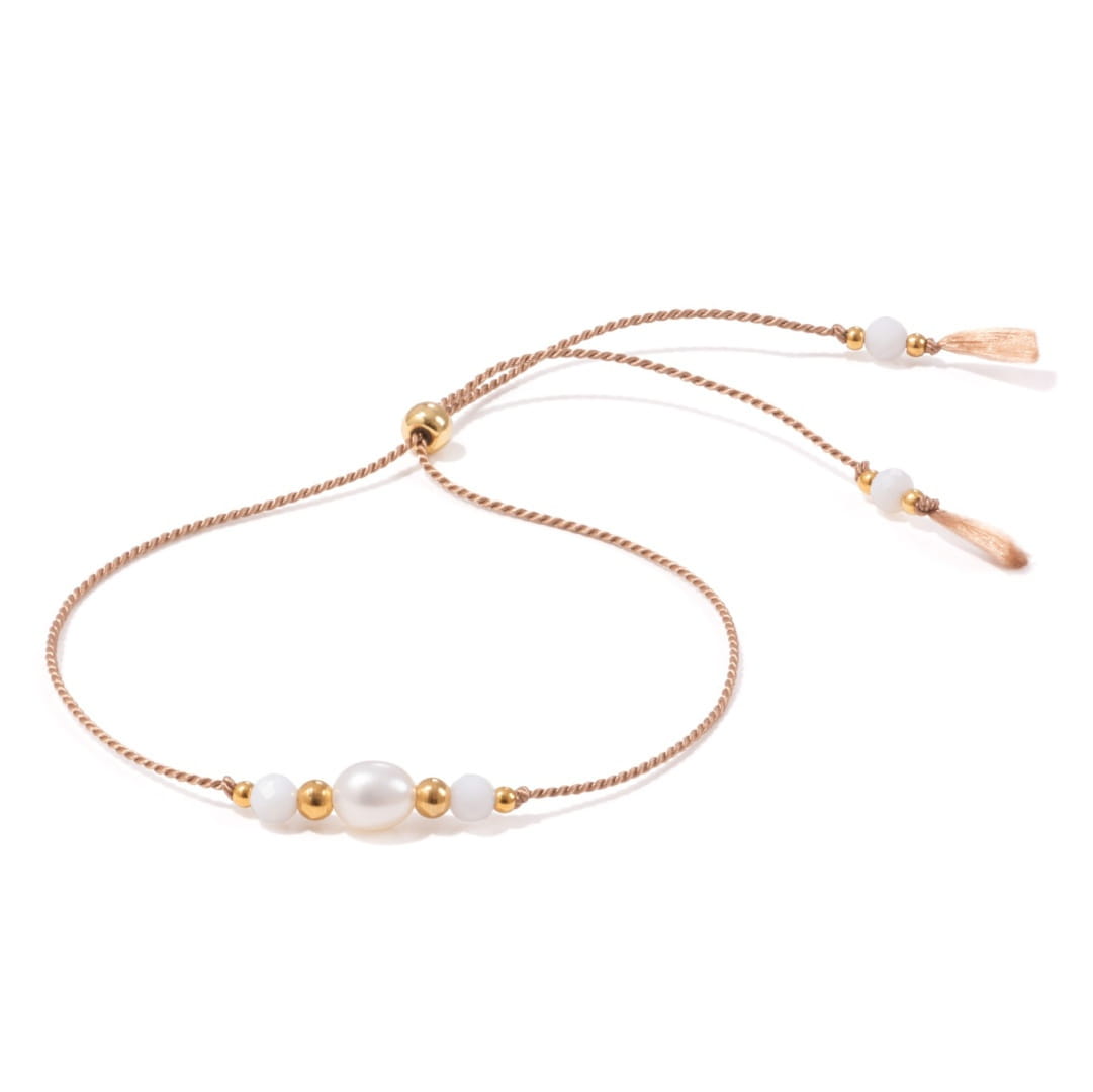 Bransoletka z kamieniem księżycowym i perłą na beżowej nici jedwabnej ozdobiona złotymi kuleczkami ze stali szlachetnej. Długość bransoletki można regulować z pomocą wygodnego stopera, dopasowując ją do swoich potrzeb.