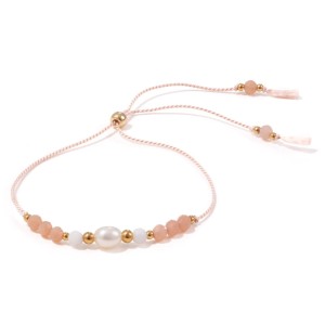 Delikatna bransoletka z perłą otoczoną muszlą oraz kamieniami słonecznymi. Całości dopełniają złote kuleczki, które podkreślają elegancki charakter tej biżuterii. Umieszczone na wytrzymałej jedwabnej nici w kolorze Nude doskonale się z nią komponują, tworząc harmonijną całość. Długość bransoletki można dowolnie regulować korzystając z wygodnego stopera.