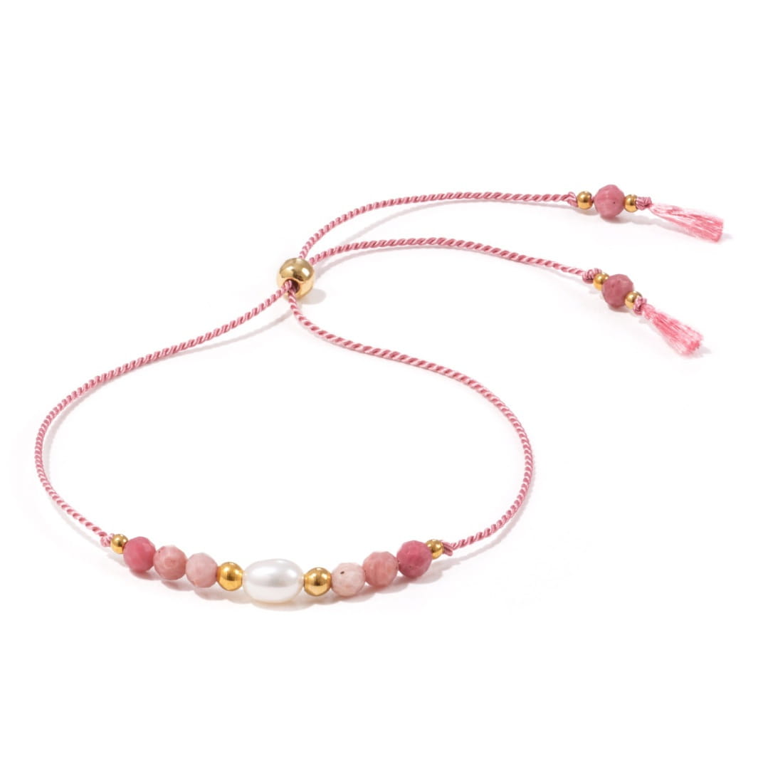 Gustowna bransoletka z kamieniami rodonitu oraz perłą na różowej jedwabnej nici. Ułożony odcieniami rodonit tworzy harmonijną kompozycję kolorystyczną, której charakteru dodają złote kuleczki ze stali szlachetnej. Wytrzymała jedwabna nić sprawia, że bransoletka nie zostanie przypadkowo zerwana, a regulacja długości pozwala dopasować ją do każdego nadgarstka.