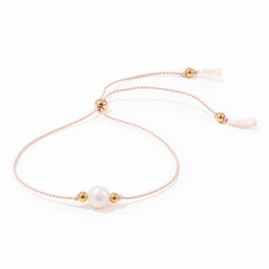 Bransoletka z perełką na jedwabnej nici ozdobiona złotymi kuleczkami ze stali szlachetnej. Bransoletkę można regulować za pomocą wygodnego stopera i dopasować do każdego nadgarstka.