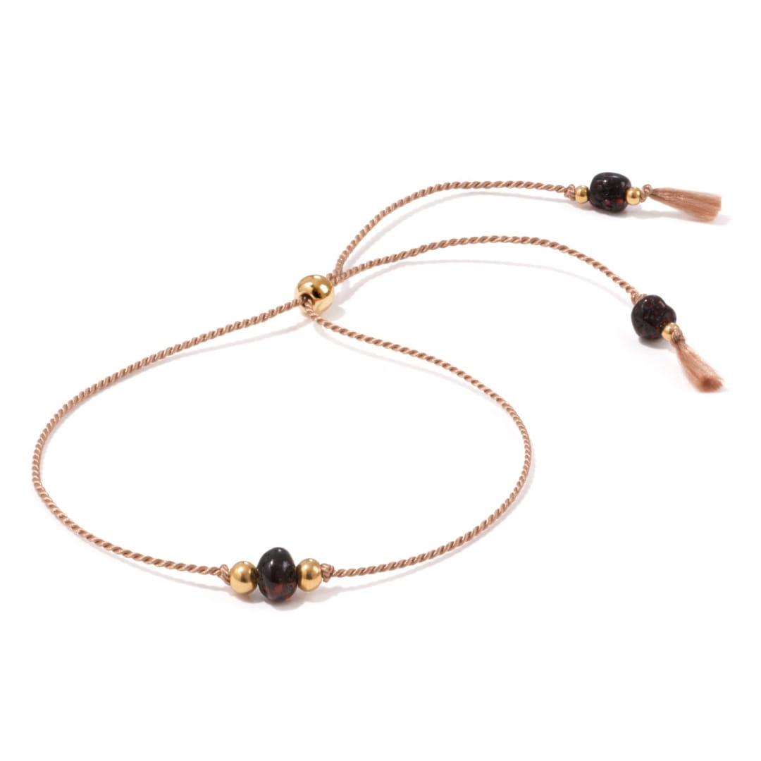 Bransoletka z bursztynem bałtyckim na jedwabnej nici. Wokół bursztynu złote kuleczki ze stali szlachetnej, która jest trwała i bezpieczna dla alergików. Wytrzymała jedwabna nić w kolorze złotym idealnie wpisuje się w elegancką kolorystykę bransoletki z bursztynem. Bransoletkę można regulować za pomocą wygodnego stopera, dzięki czemu pasuje na każdą rękę.