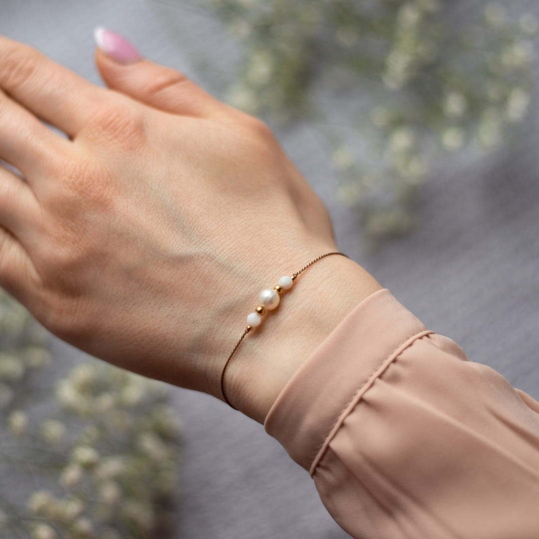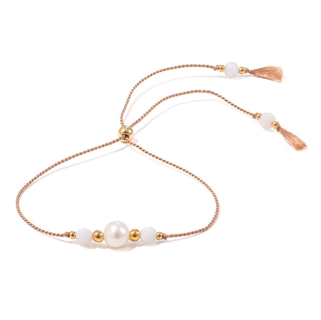 Lśniąca bransoletka z perłą i kamieniem księżycowym ozdobiona złotymi kuleczkami ze stali szlachetnej. Koraliki umieszczone są na jedwabnej nici. Jej długość można regulować z pomocą wygodnego stopera, dopasowując ją do swojego nadgarstka.